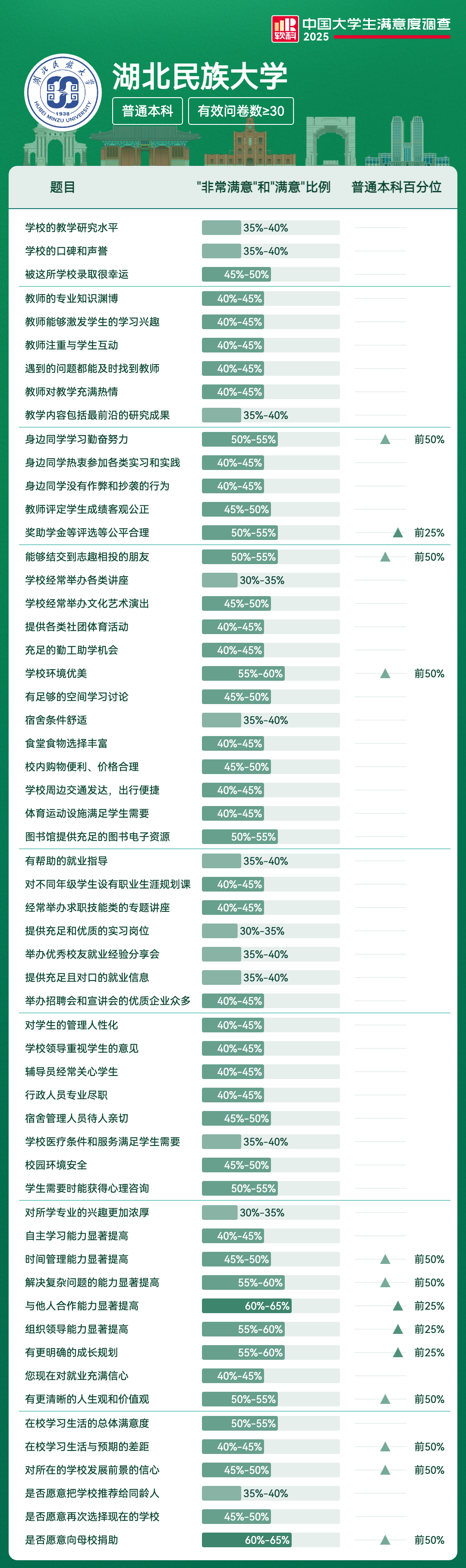 | 满意度前5项 | 满意及以上比例 | 全国高校排名区间 |