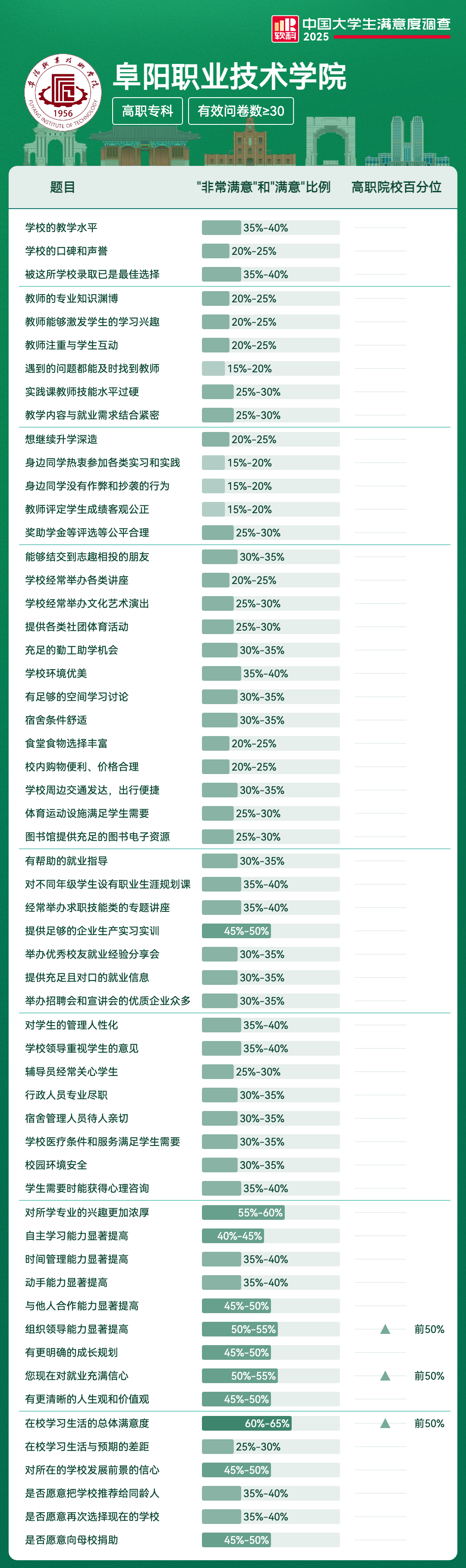 | 在校学习生活的总体满意度 | 60%-65% | 前50% |