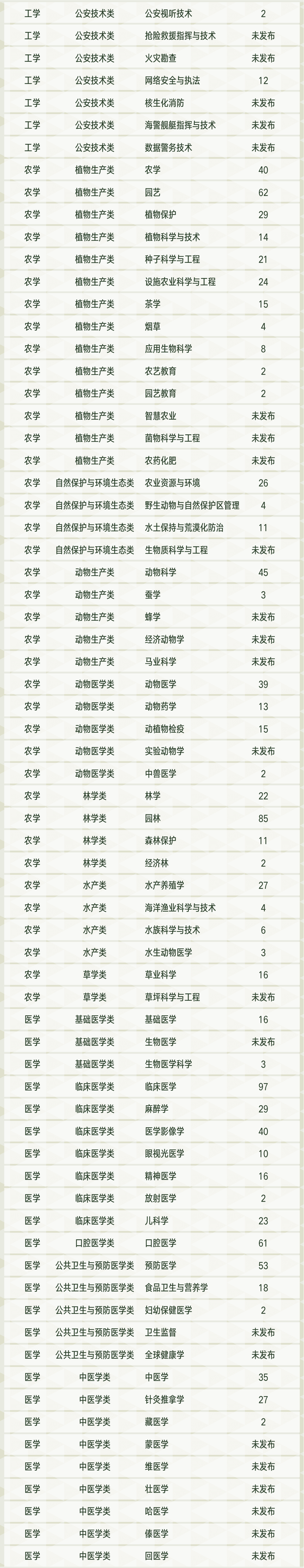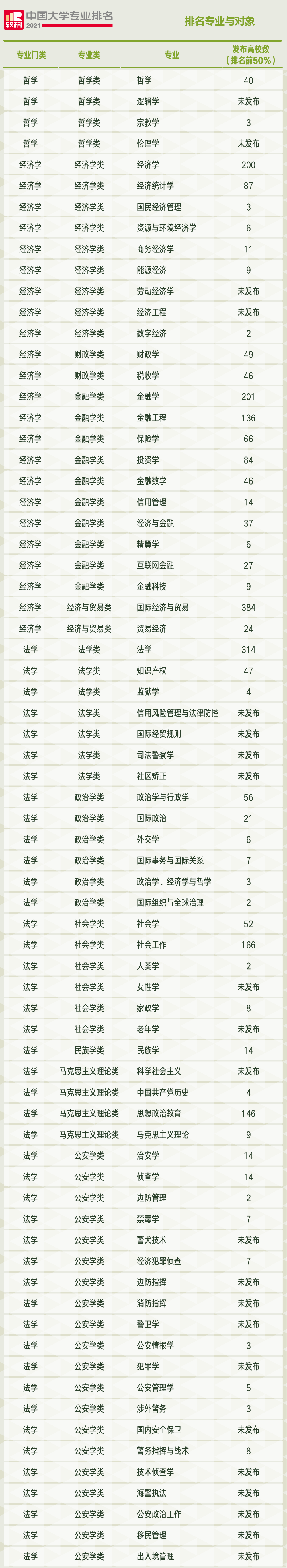 “软科中国大学专业排名”排名的专业以教育部《普通高等学校本科专业目录(2020年版)》中设置的专业为准。在每个专业下,排名的对象是开设该专业且在2019年有本科毕业生的普通高校。中国消防救援学院、中国科学院大学、中国社会科学院大学以及军事院校等因情况特殊暂未纳入排名。 2021“软科中国大学专业排名”发布的专业是至少有4所大学开设的专业,符合条件的专业共有509个,涉及92个专业类、12个专业门类。每个专业发布位列前50%的高校,共有925所高校的28550个专业上榜。排名专业名单及各专业的发布数见下表: