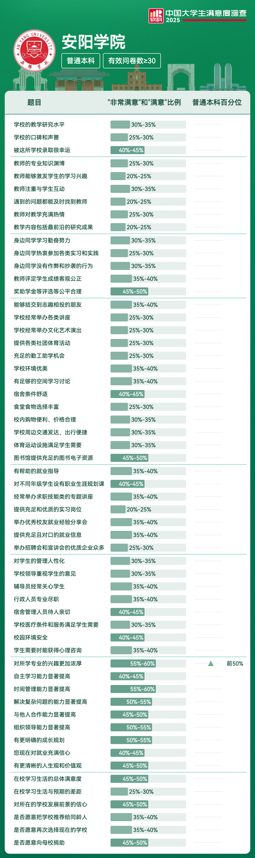 | 满意度前5项 | 满意及以上比例 | 全国高校排名区间 |