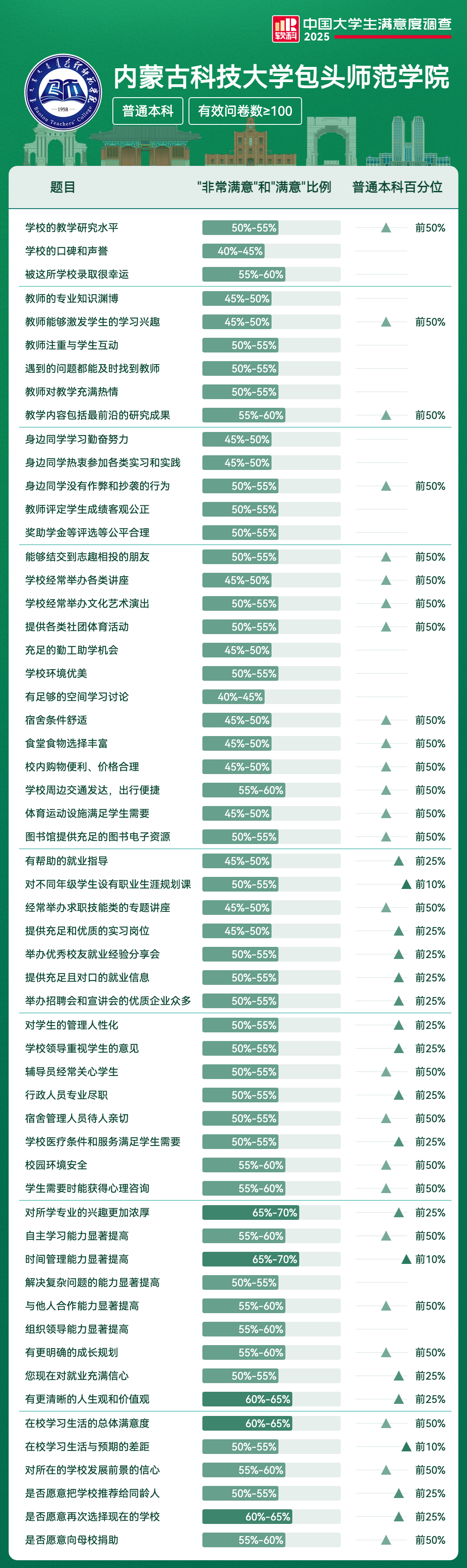 | 满意度前5项 | 满意及以上比例 | 全国高校排名区间 |