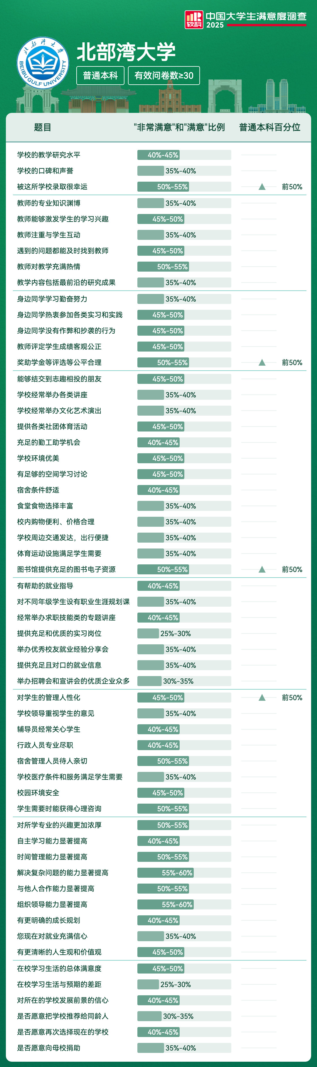 | 满意度前5项 | 满意及以上比例 | 全国高校排名区间 |