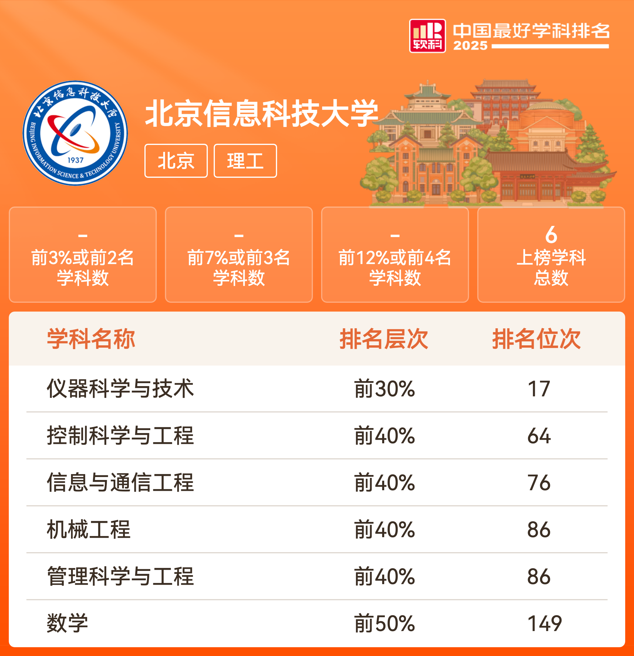 北京信息科技大学是一所以工为主体,工、管、理、经、文、法6个学科门类协调发展、信息学科最齐全的北京市重点大学,是1981年全国首批硕士学位授权单位,具有推荐免试攻读硕士研究生资格,面向全国30个省(自治区、直辖市)招生。在长达84年的办学历史中,形成了鲜明的信息特色、行业特色、军工特色。学校是沙河高教园“6+1”大学城中唯一的市属高校,新校区位于中关村国家工程技术创新基地,毗邻中国移动国际信息港。