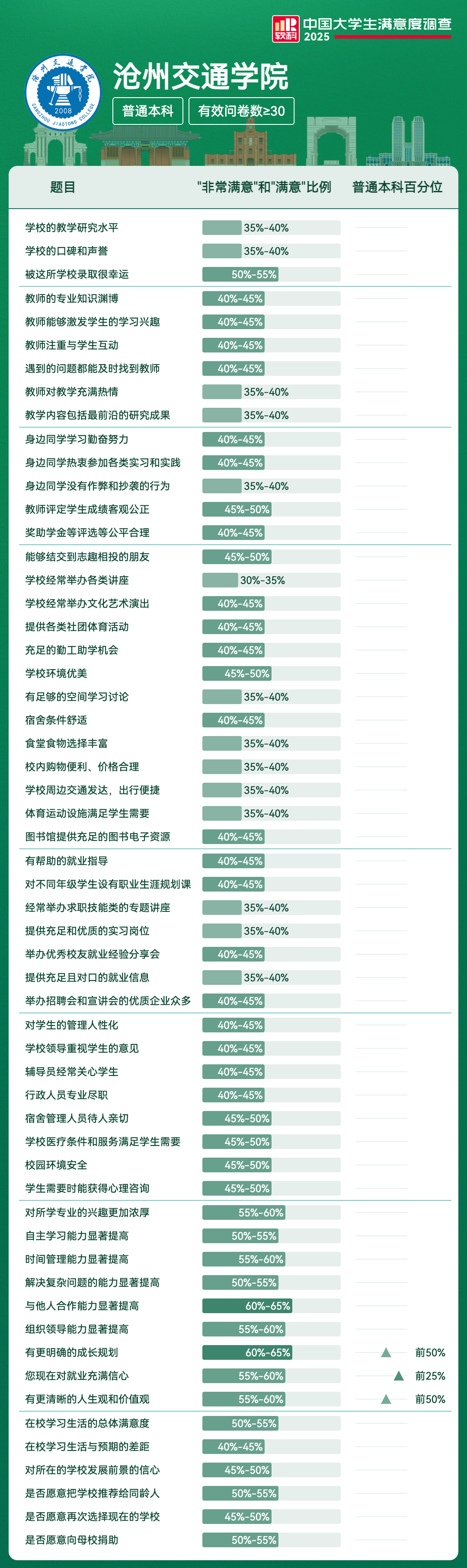 | 满意度前5项 | 满意及以上比例 | 全国高校排名区间 |