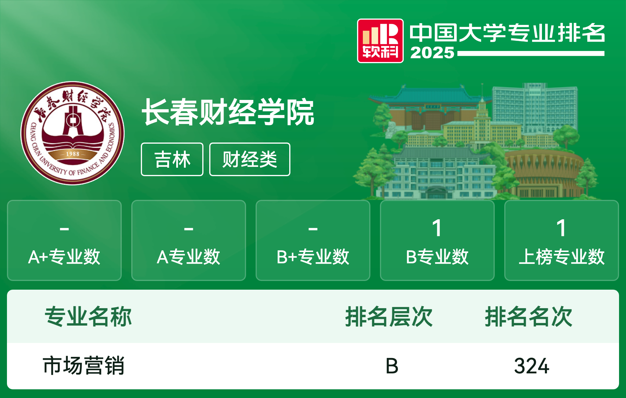 长春财经学院为独立设置的全日制民办普通本科高等学校,始建于1988年学校以经济学、管理学为主,兼顾法、文、理、工等学科门类,开设会计学、审计学、财务管理、金融学、金融工程、保险学、投资学、税收学、国际经济与贸易、国际商务、经济学、经济统计学、数据科学与大数据技术、工商管理、市场营销、人力资源管理、旅游管理、物流管理、电子商务、跨境电子商务、网络与新媒体、信息管理与信息系统、计算机科学与技术。