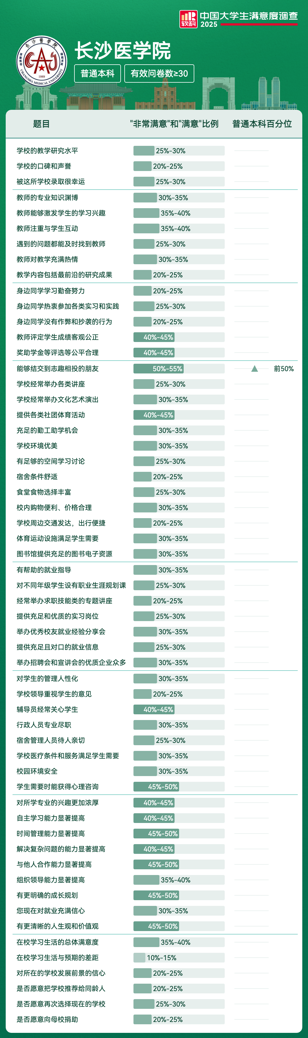 | 满意度前5项 | 满意及以上比例 | 全国高校排名区间 |