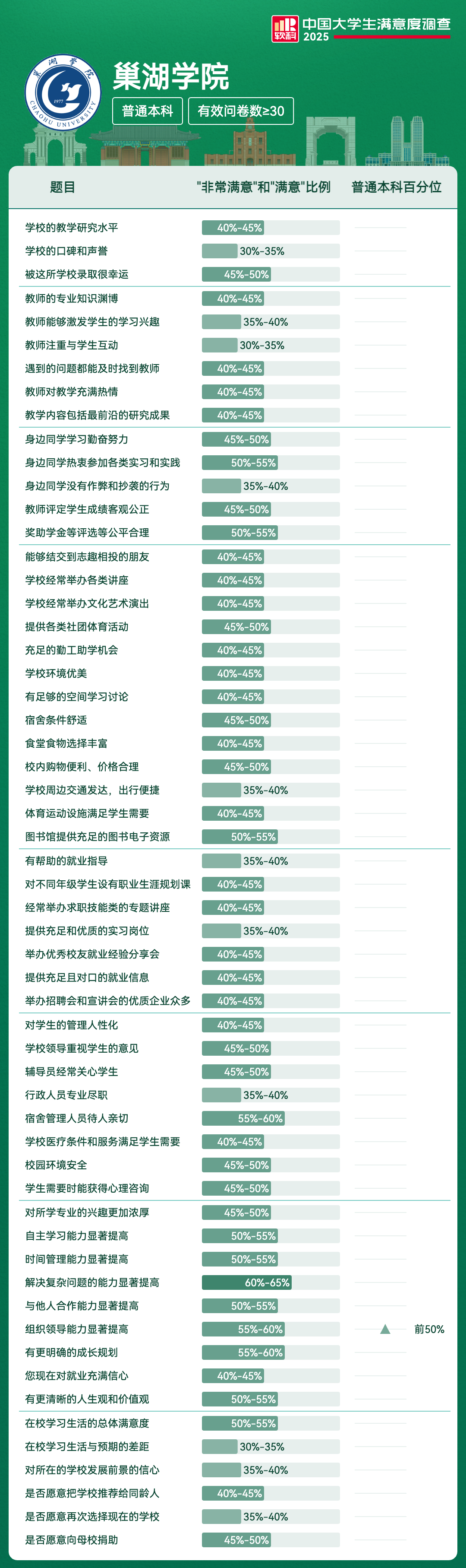 | 满意度前5项 | 满意及以上比例 | 全国高校排名区间 |
