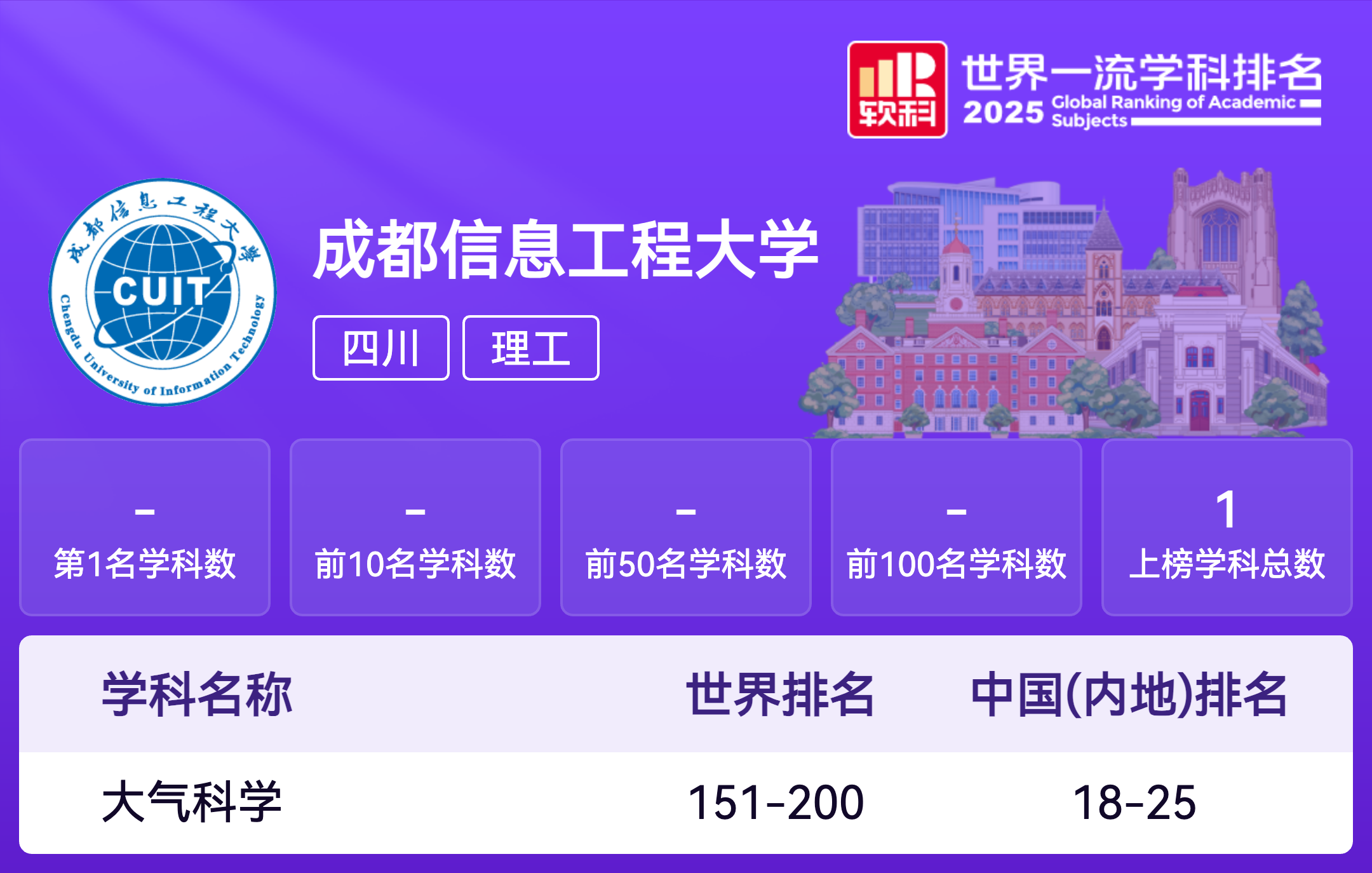 成都信息工程大学是四川省和中国气象局共建、四川省重点发展的省属普通本科院校。学校创建于1951年,1956年改制为中央气象局成都气象学校;1978年升格为本科院校——成都气象学院;2000年由中国气象局划转四川省,更名为成都信息工程学院;2001年,原隶属国家统计局的四川统计学校整体并入;2015年更名为成都信息工程大学。学校是国家“中西部基础能力建设工程”建设高校、首批教育部“卓越工程师教育培养 ”实施院校、四川省首批一流学科建设高校、四川省新增博士学位授予单位建设高校。学校现有航空港、龙泉两个校区,占地面积2000余亩。学校拥有馆藏丰富的图书馆和设施齐备的现代化体育场馆,环境幽雅,景色宜人,是读书治学的理想场所。