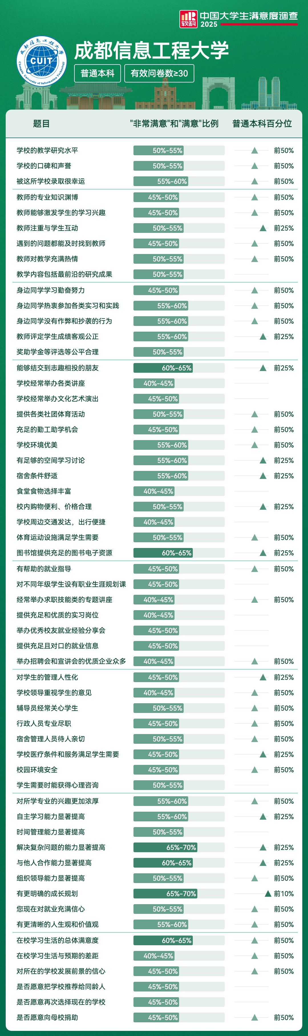 满意度前5项 | 满意及以上比例 | 全国高校排名区间 |