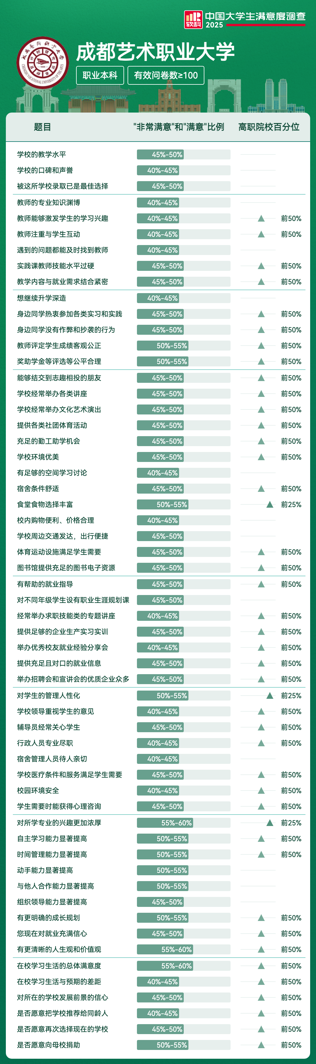 | 食堂食物选择丰富 | 50%-55% | 前25% |