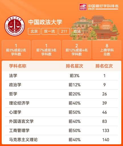 中国政法大学的前身是1952年由北京大学、清华大学、燕京大学、辅仁大学四校的法学、政治学、社会学等学科组合而成的北京政法学院;1960年成为国家确定的全国重点高校;1983年,北京政法学院与中央政法干校合并,组建成立中国政法大学。中国政法大学直属于教育部,位列国家“双一流”建设高校、“211工程”高校、“985工程优势学科创新平台”,是一所以法学为特色和优势,兼有文学、历史学、哲学、经济学、管理学、教育学、理学、工学等学科的全国重点大学。