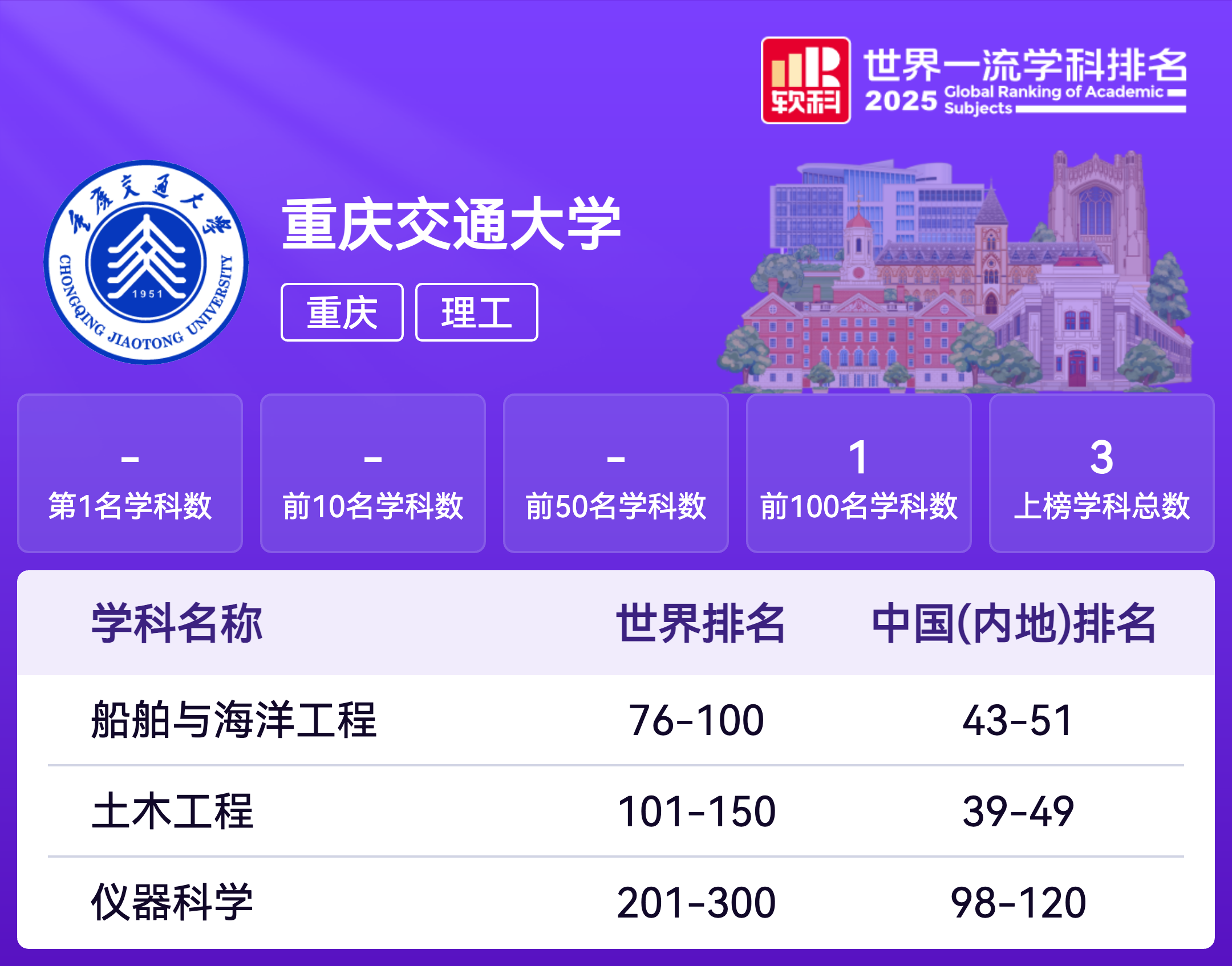 重庆交通大学是一所交通特色鲜明、以工为主的多科性大学。1951年,根据毛泽东的指示,为修建康藏公路、建设大西南,刘伯承、邓小平领导的西南军政委员会创办学校,时名西南交通专科学校。1960年,组建重庆交通学院,成都工学院土木系、四川冶金学院冶金系、武汉水运学院水工系等相继并入。2000年,学校由交通部划转重庆市管理,为省部共建高校。2006年更名为重庆交通大学,并被增列为博士授予单位。重庆交通大学获国家“中西部高校基础能力建设工程”支持,为教育部“卓越工程师教育培养计划”实施高校,入选“国家级大学生创新创业训练计划”,获评国家大学生文化素质教育基地、中国政府奖学金来华留学生接收院校、全国毕业生就业典型经验高校、全国创新创业典型经验高校,是教育部本科教学工作水平评估优秀学校、重庆市一流学科建设高校,为“一带一路”中波大学联盟发起成员、中俄交通大学联盟核心成员。重庆交通大学现有南岸、科学城、大坪三个校区,占地3000余亩,校舍建筑面积83万余平方米。