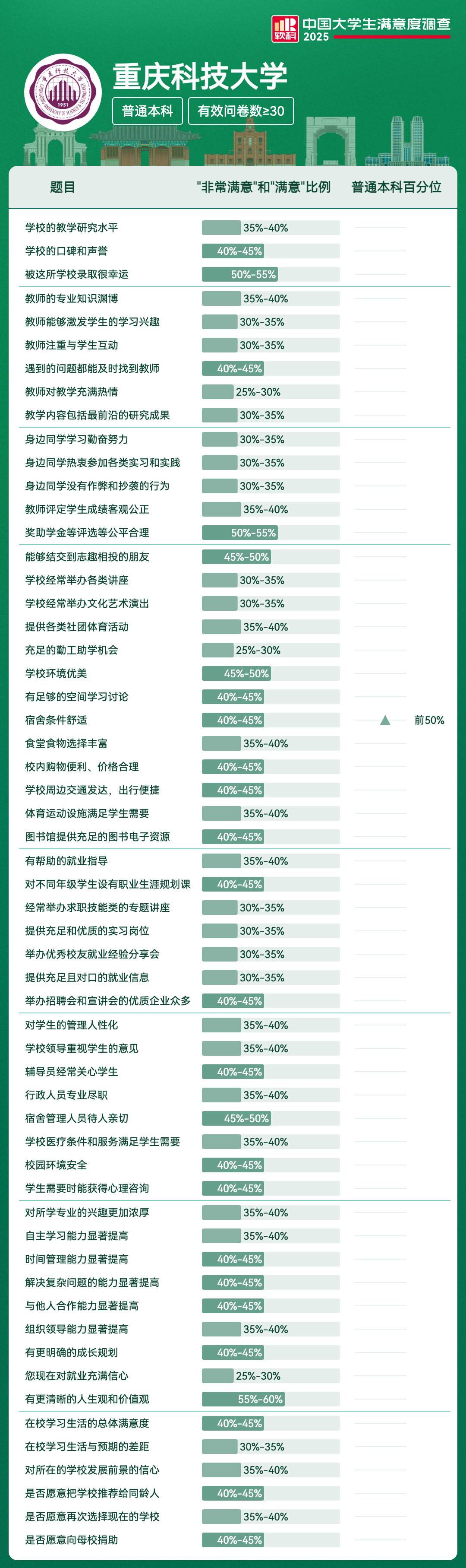 满意度前5项 | 满意及以上比例 | 全国高校排名区间 |