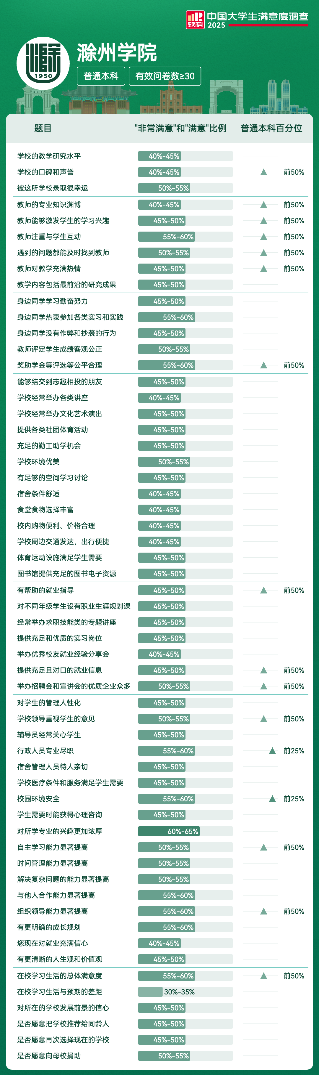 | 满意度前5项 | 满意及以上比例 | 全国高校排名区间 |