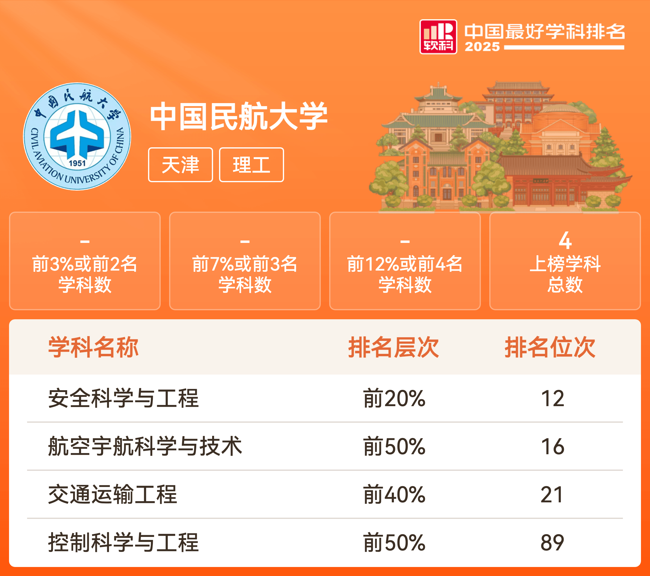 中国民航大学是中国民用航空局直属的一所以培养民航高级工程技术和管理人才为主的高等学府,是中国民用航空局、天津市人民政府、教育部共建高校。 学校的前身是1951年9月成立的军委民航局第二民用航空学校,由毛泽东主席亲自任命方槐将军为校长,周恩来总理亲自选定校址。1981年更名为中国民用航空学院,2006年5月30日,更名为中国民航大学。 学校拥有工、管、理、经、文、法、艺7个学科门类,拥有安全科学与工程一级学科博士授权点,11个一级学科硕士授权点,6个专业学位硕士授权点,34个本科专业,6个专科专业,学科专业覆盖民航主要业务领域,具有推荐优秀应届本科毕业生免试攻读研究生资格。学校入选天津市“双一流”建设计划,是天津市高水平特色大学建设高校,安全科学与工程入选天津市一流建设学科,航空宇航和交通运输入选天津市特色学科(群)建设名单。学校拥有2个国家级一流本科专业建设点、3个国家级特色专业、3个国家级专业综合改革试点专业、4个教育部卓越工程师教育培养计划专业。