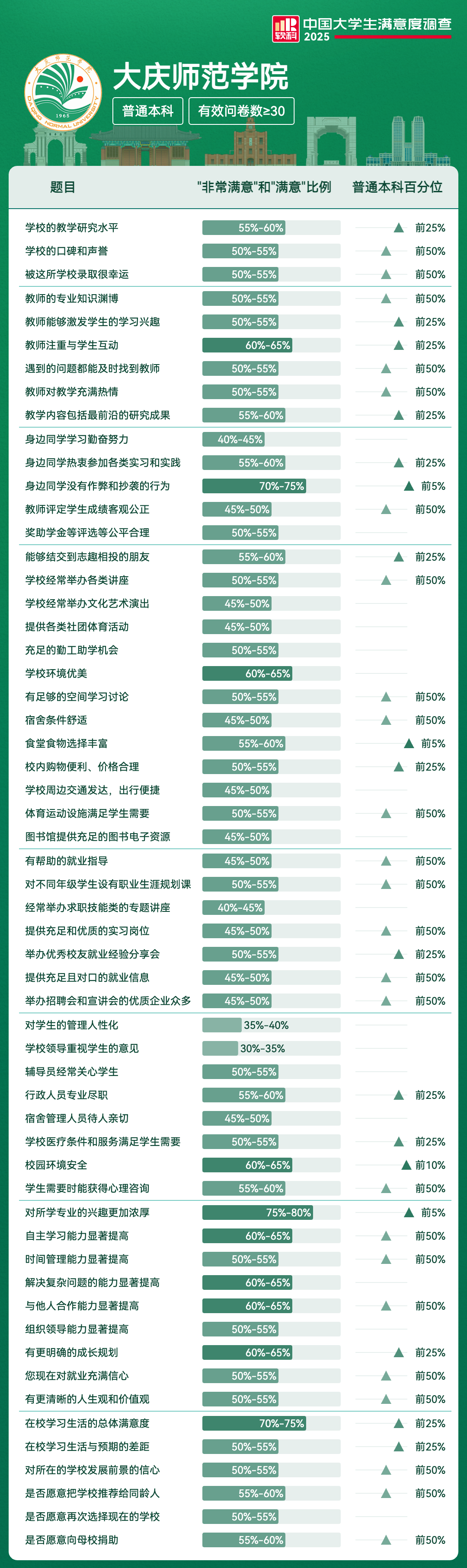 满意度前5项 | 满意及以上比例 | 全国高校排名区间 |