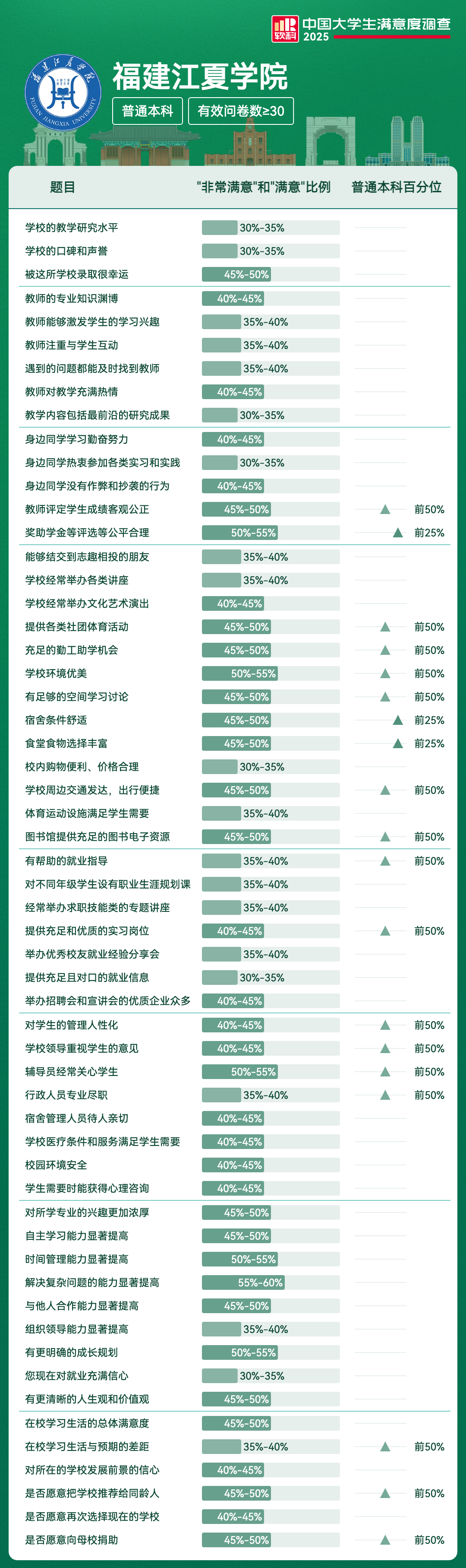 宿舍条件舒适 | 45%-50% | 前25% |