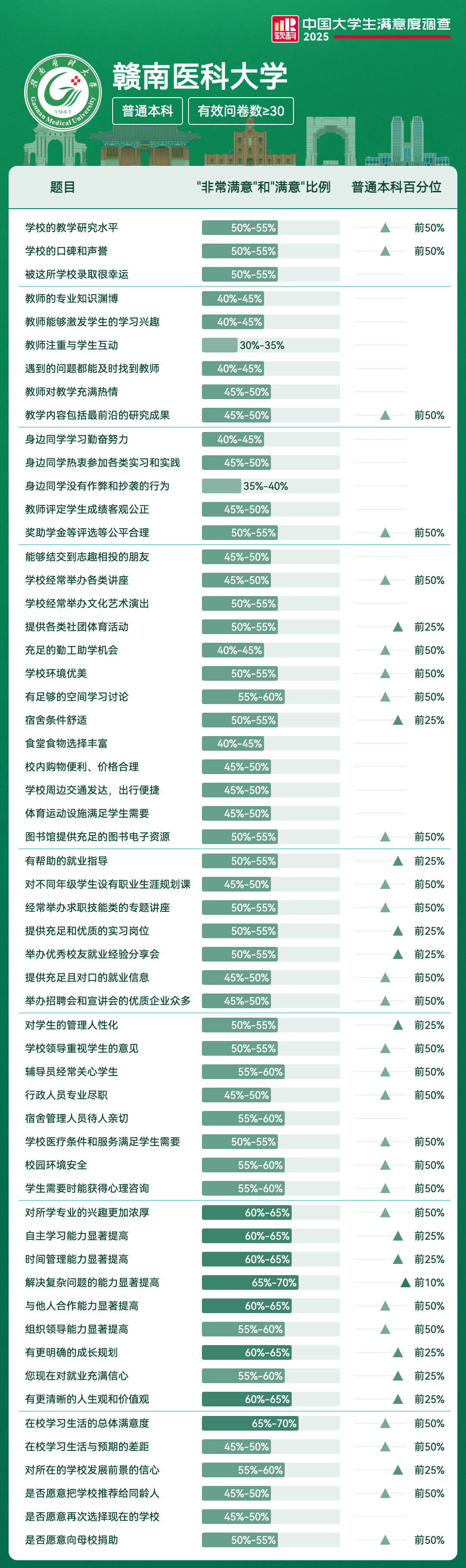 | 宿舍条件舒适 | 50%-55% | 前25% |