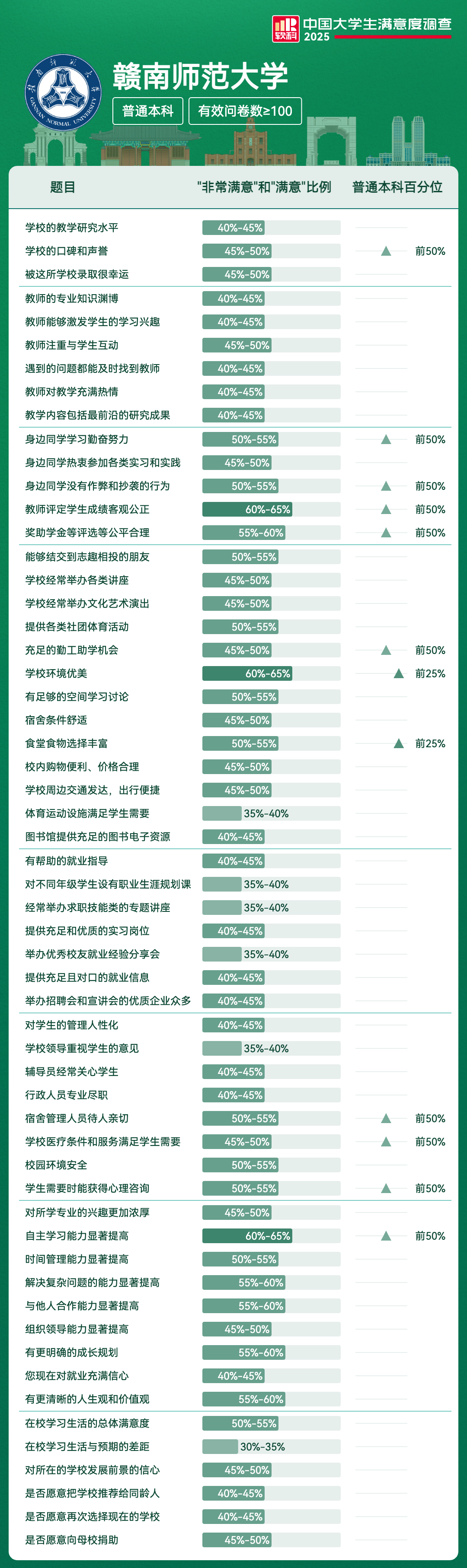 满意度前5项 | 满意及以上比例 | 全国高校排名区间 |