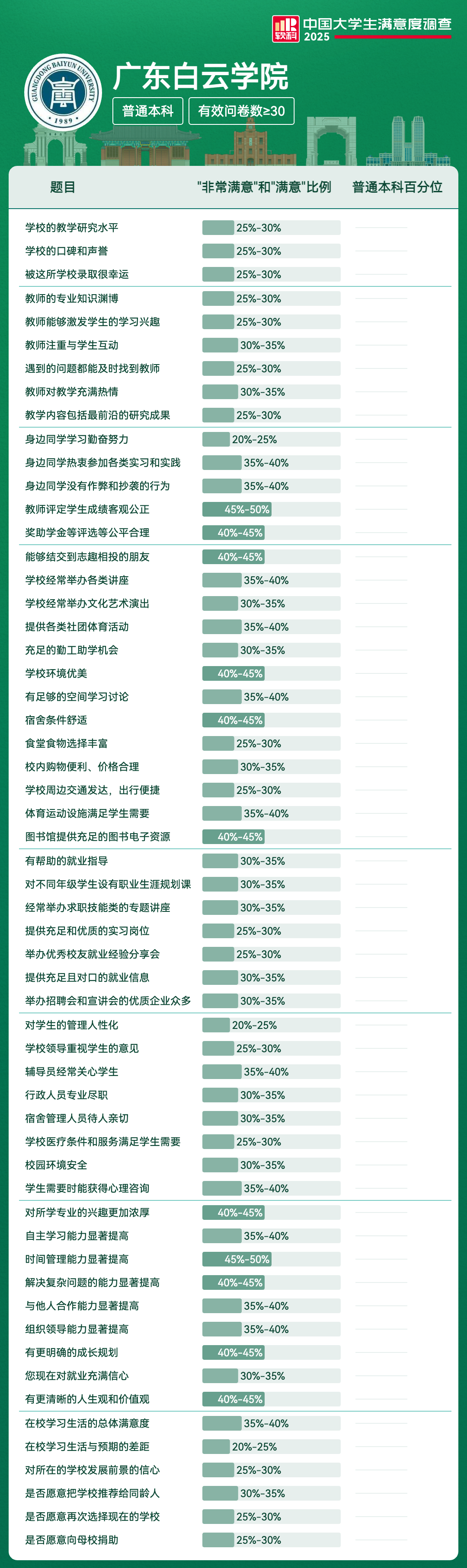| 满意度前5项 | 满意及以上比例 | 全国高校排名区间 |
