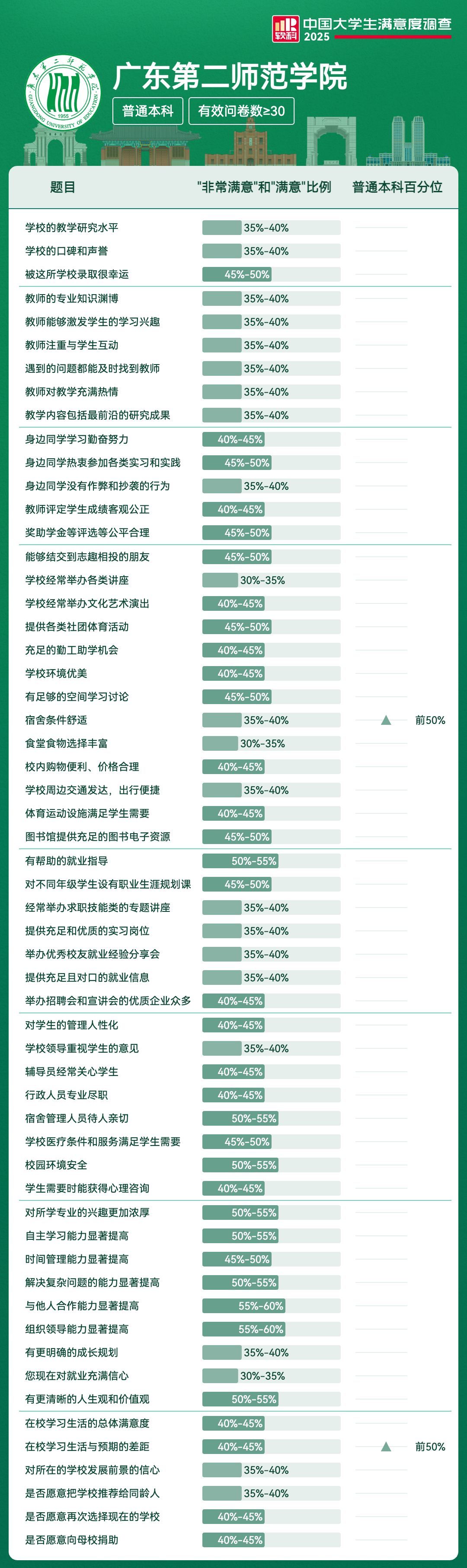 | 宿舍条件舒适 | 35%-40% | 前50% |