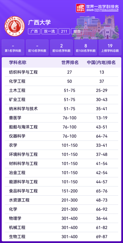 学科齐全,实力雄厚 广西大学学科门类齐全,现有1个“世界一流”建设学科,2个“部区合建”一流学科群,2个国家重点学科,1个国家重点(培育)学科;17个一级学科博士点。工程学等6个学科进入ESI全球排名前1%。有28个国家一流本科专业,12个国家特色专业。