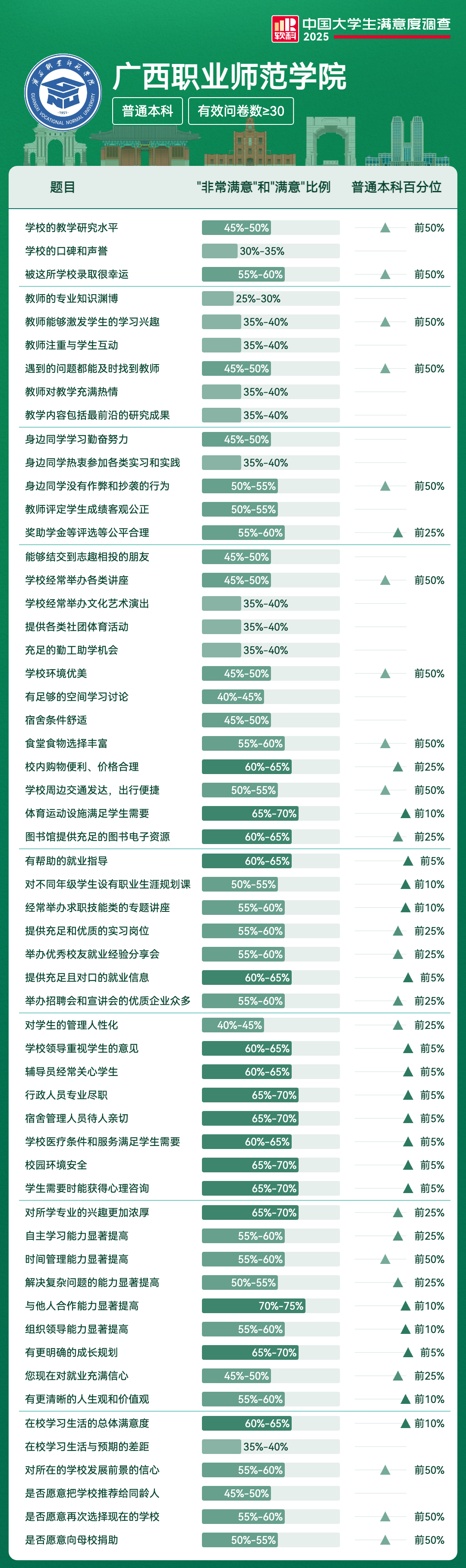 | 学校领导重视学生的意见 | 60%-65% | 前5% |