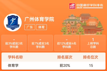 广州体育学院始建于1956年7月,是华南地区唯一独立建制具有本科和研究生教育的体育高等学府,也是新中国成立以来国内较早专门从事体育教育的院校之一,隶属于广东省人民政府。具有体育学一级学科硕士学位授予权(含体育学全部二级学科硕士点)和医学门类的运动医学硕士点。是国家体育总局若干运动项目的高、中、初级教练员岗位培训单位,具有一级裁判员、一级运动员审批权。拥有全国青少年校园足球“国培”基地、国家级社会体育指导员培训基地、国家级青少年体育俱乐部等15个省部级教学训练基地。有3个广东省联合培养研究生示范基地、114个本科校外实习基地。学校拥有首批国家体育总局重点实验室、体育社会科学重点研究基地。