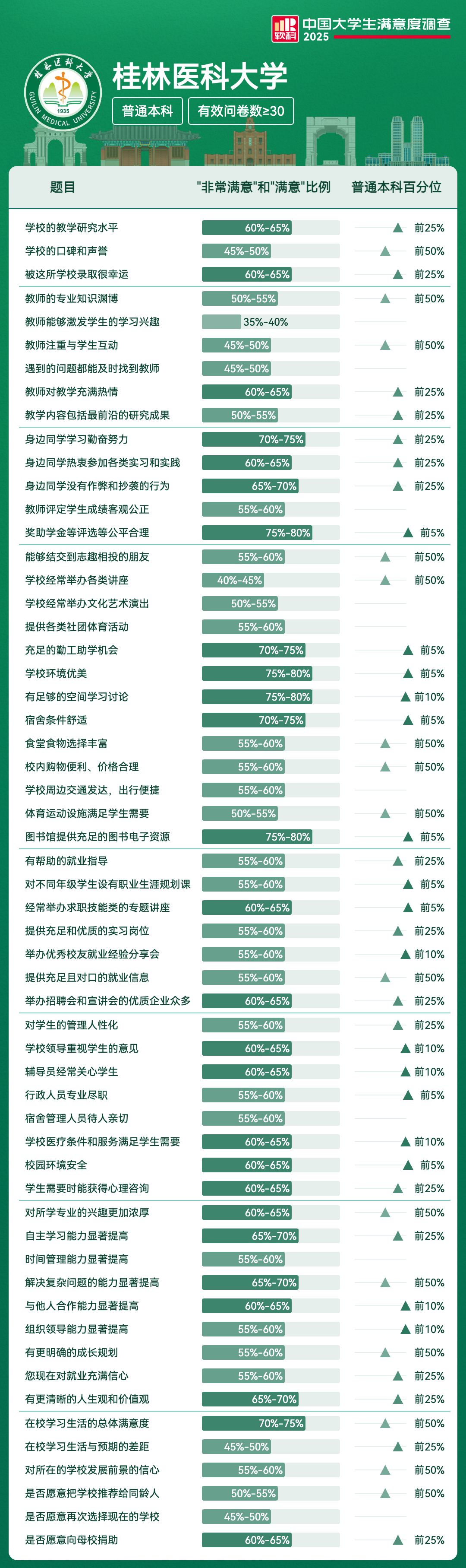 | 满意度前5项 | 满意及以上比例 | 全国高校排名区间 |