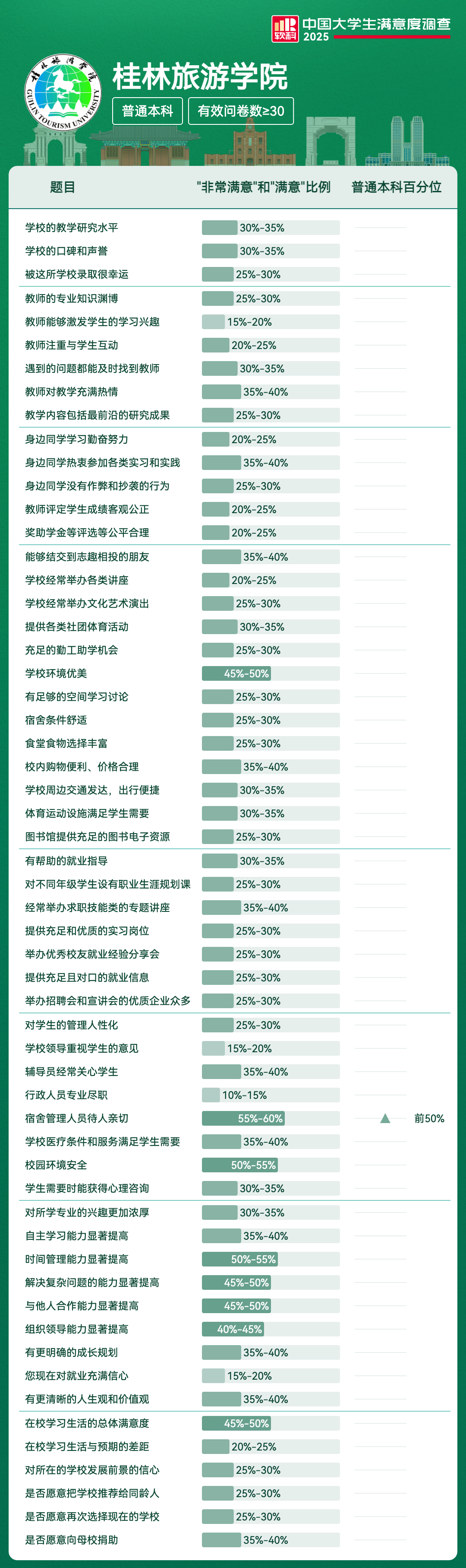 宿舍管理人员待人亲切 | 55%-60% | 前50% |