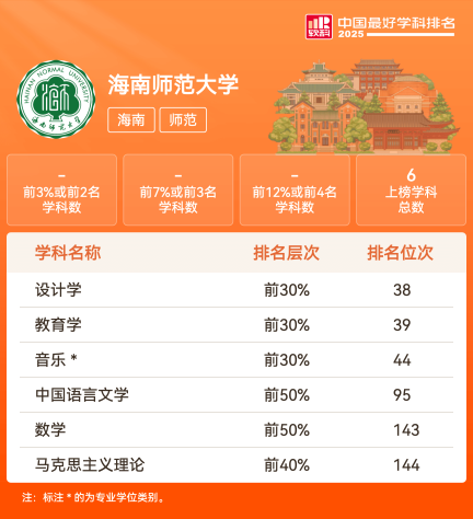 海南师范大学位于美丽的滨海旅游城市、国家历史文化名城——海口市,是海南省、教育部共建高校,海南省重点大学,为海南省卓越师资、高级专门人才重要培养基地和科学研究基地。建校至今,学校已为社会培养了18万余名基础教育师资和各类高级人才,被誉为“琼岛名校,教师摇篮”。学校前身可追溯到有300多年历史的琼台书院,1949年秋正式创建国立海南师范学院,是海南第一所公办高校;1952年在高等学校院系调整中更名为海南师范专科学校;1986年恢复海南师范学院建制;1999年与海南教育学院合并,成立新的海南师范学院;2007年更名为海南师范大学。2013年获批博士学位授予权,2015年成为海南省与教育部共建高校。海南师范大学现有龙昆南、桂林洋两个校区,占地面积约3100亩,设有23个学院(其中本科教学学院21个)。