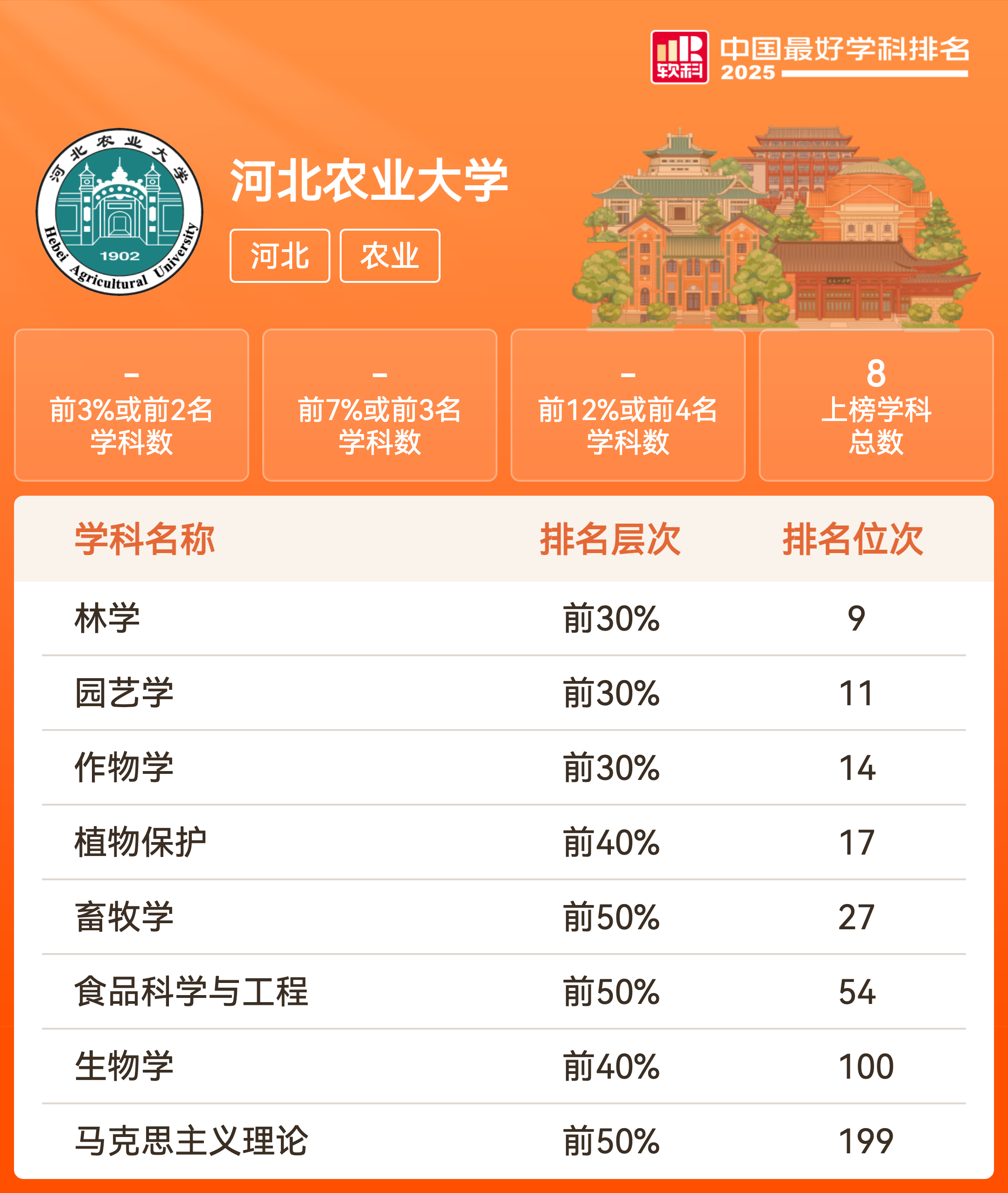河北农业大学是河北省人民政府分别与教育部、农业农村部、国家林业和草原局共建的省属重点骨干大学,为大众创业万众创新示范基地,教育部“卓越工程师教育培养计划”实施高校,教育部、农业农村部、国家林业和草原局首批“卓越农林人才教育培养计划”实施高校,为首批“中西部高校基础能力建设工程”支持高校。学校的前身是创建于1902年的直隶农务学堂,是我国最早开展高等农业教育的院校之一,随后经历了直隶高等农业学堂、河北省立农学院、河北农学院、河北农业大学等历史时期;1995年与原河北林学院合并组建为新的河北农业大学;2000年原河北水产学校、河北畜牧科技学校并入。
