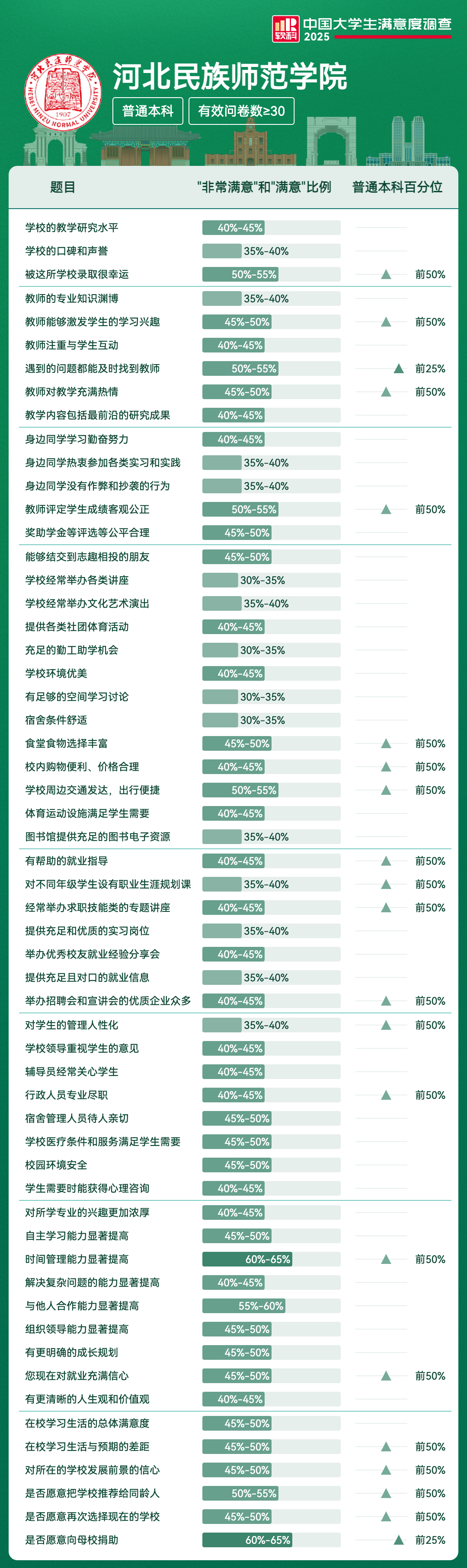 | 满意度前5项 | 满意及以上比例 | 全国高校排名区间 |
