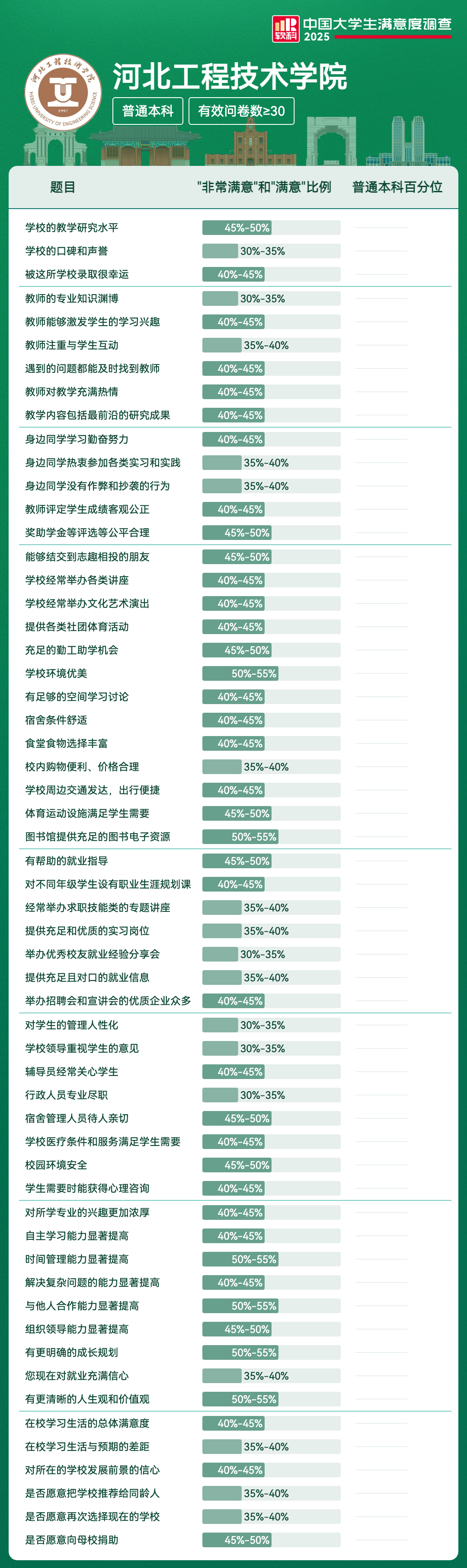 满意度前5项 | 满意及以上比例 | 全国高校排名区间 |