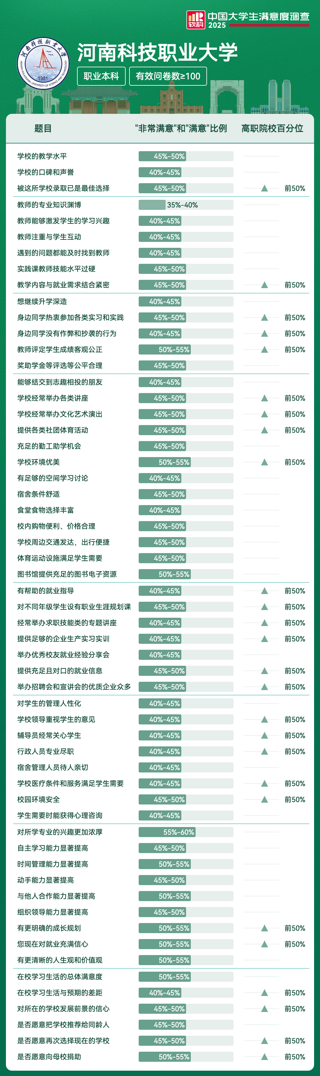 | 满意度前5项 | 满意及以上比例 | 全国高校排名区间 |
