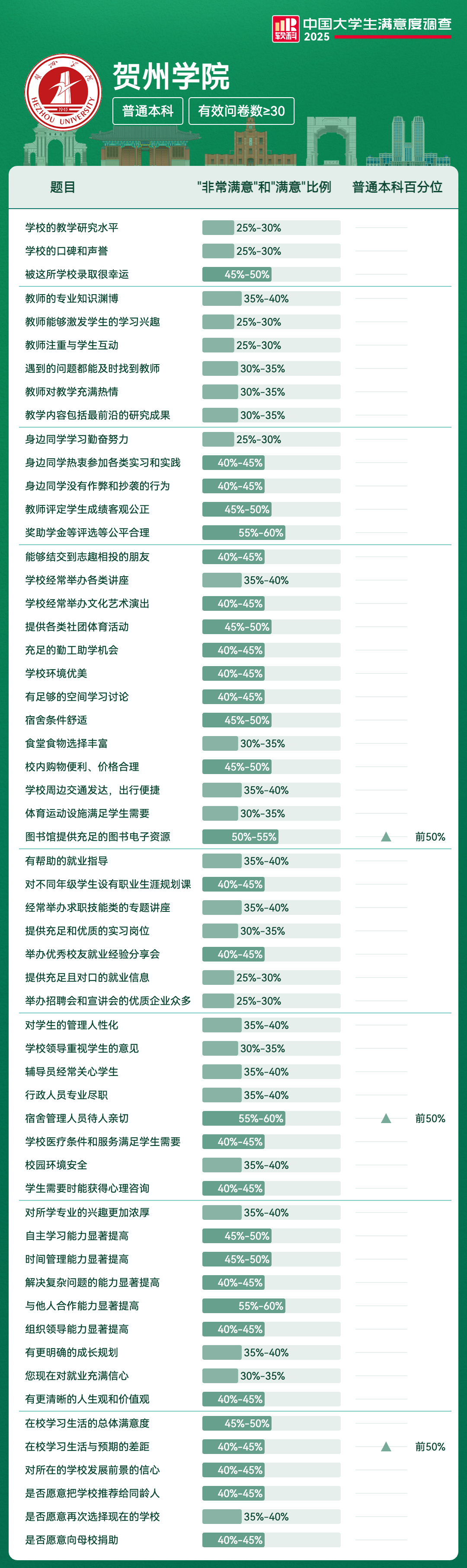 宿舍管理人员待人亲切 | 55%-60% | 前50% |