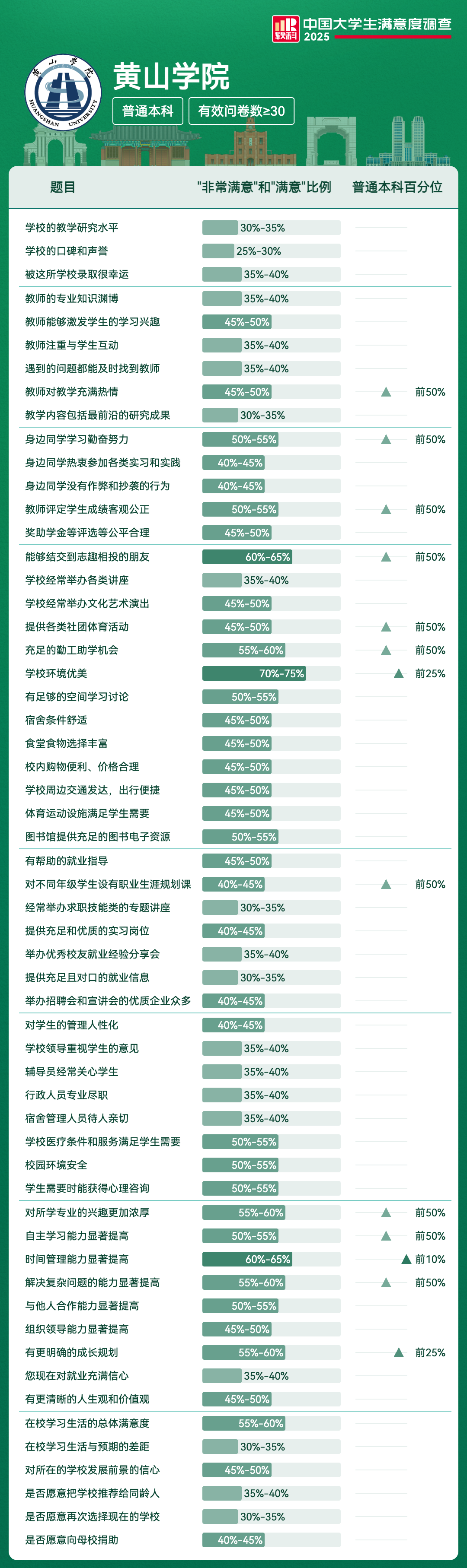 | 满意度前5项 | 满意及以上比例 | 全国高校排名区间 |