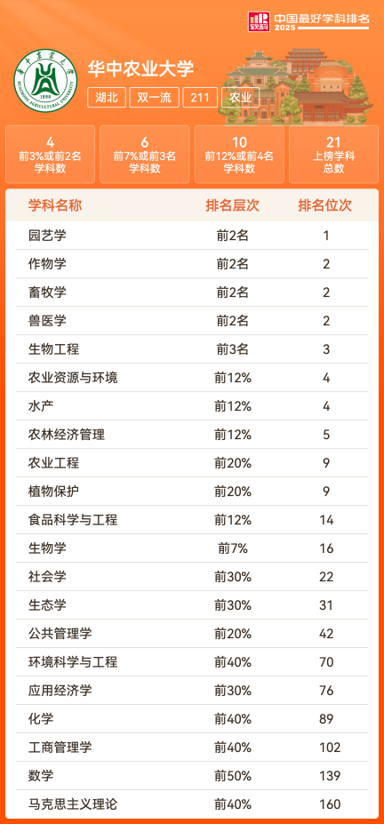 学校是教育部直属全国重点大学,2005年进入国家“211工程”建设行列,2017年入选国家首批“双一流”建设高校。前身是1898年张之洞创办的湖北农务学堂,是中国高等农业教育起点之一,已有122年办学历史。2013年,中共中央总书记、国家主席习近平给我校“本禹志愿服务队”回信,并提出“与祖国同行、为人民奉献”的殷切希望。