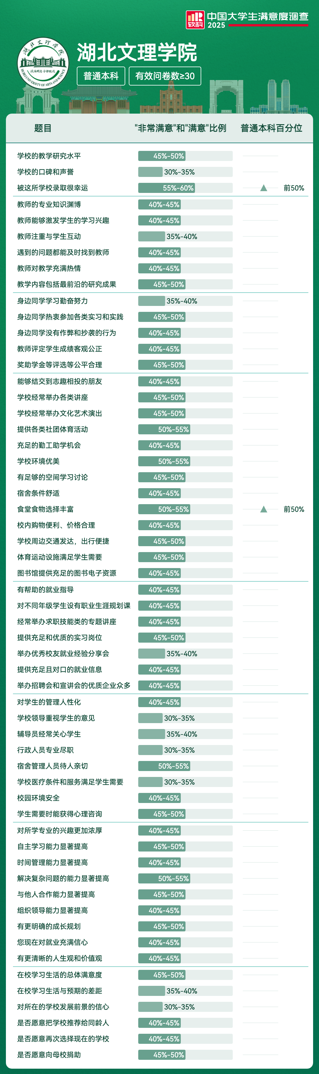| 满意度前5项 | 满意及以上比例 | 全国高校排名区间 |