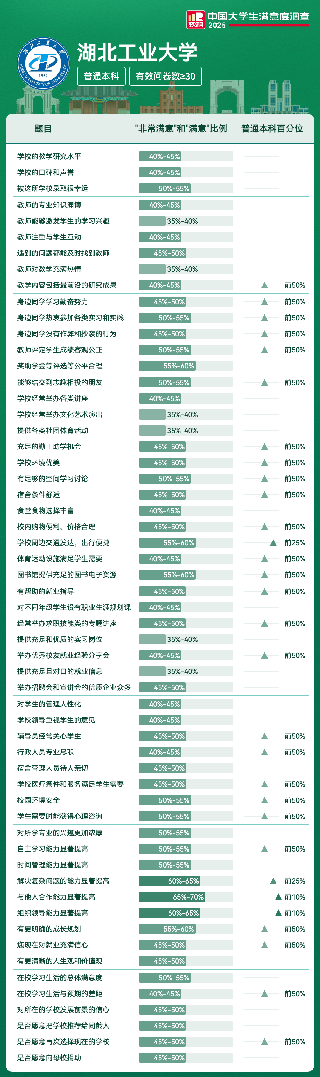满意度前5项 | 满意及以上比例 | 全国高校排名区间 |