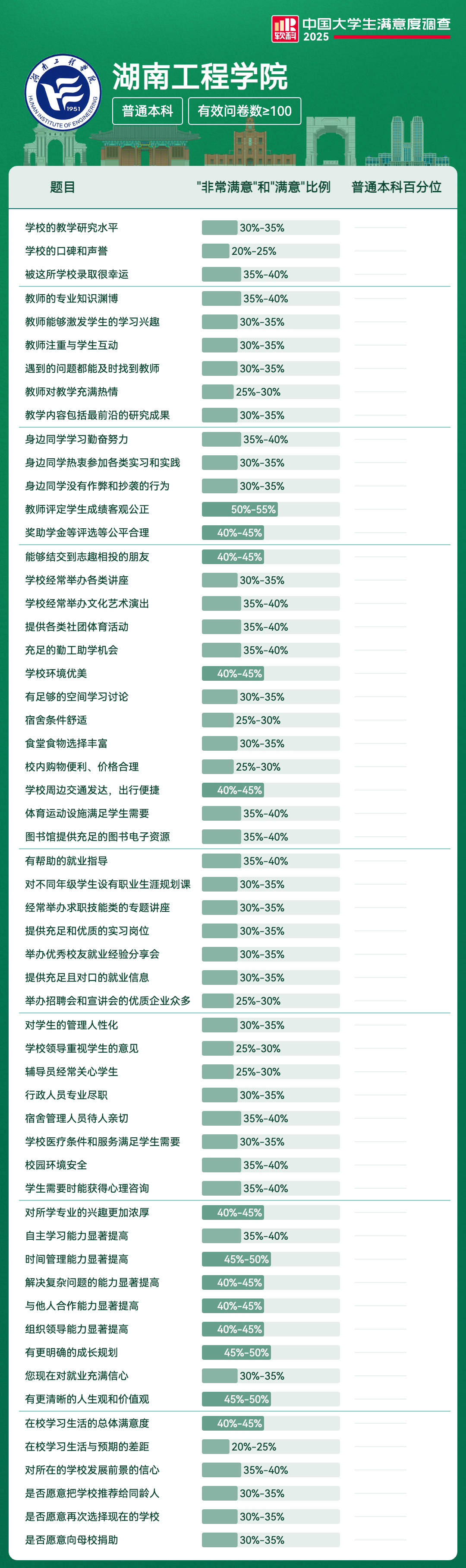 | 满意度前5项 | 满意及以上比例 | 全国高校排名区间 |