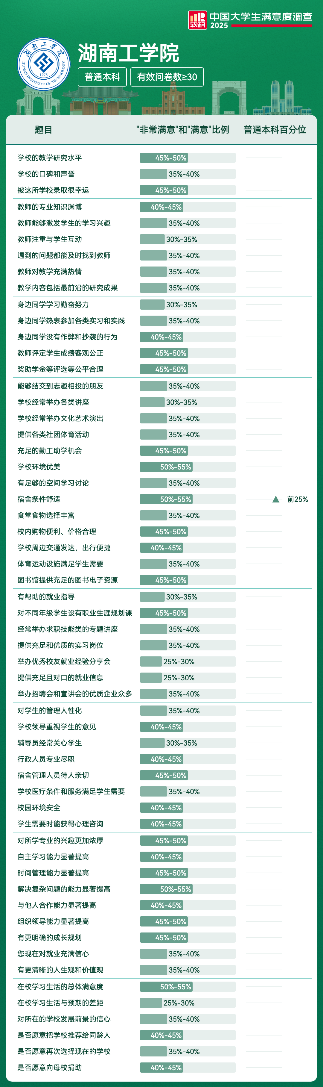 | 宿舍条件舒适 | 50%-55% | 前25% |