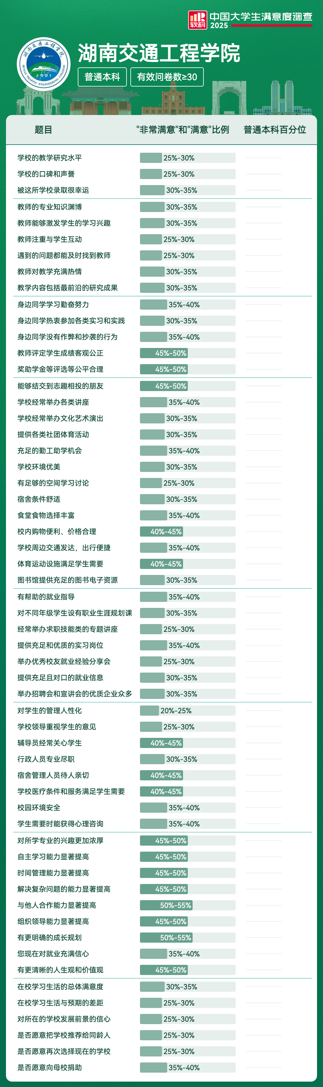 | 满意度前5项 | 满意及以上比例 | 全国高校排名区间 |