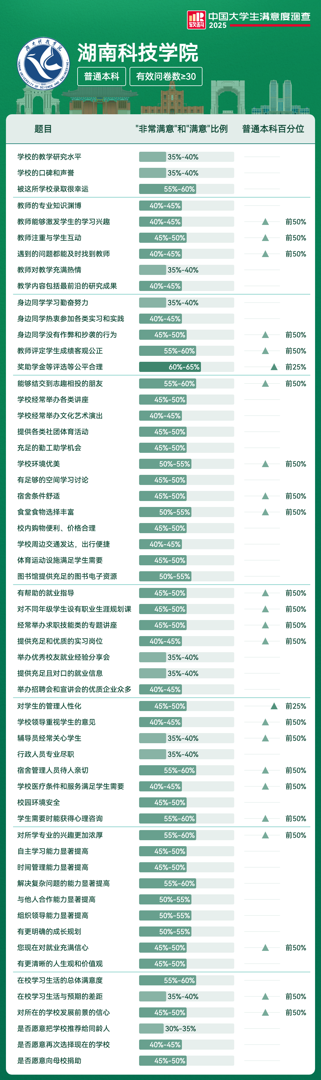 | 满意度前5项 | 满意及以上比例 | 全国高校排名区间 |