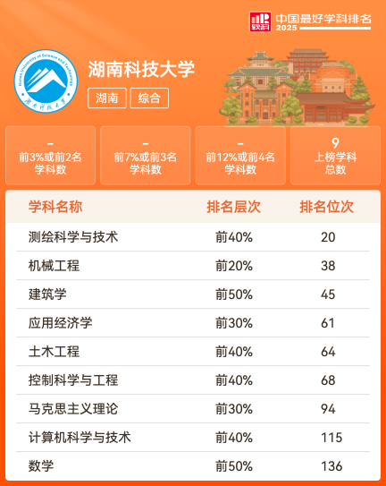 湖南科技大学办学历史悠久、学科门类齐全。学校98个本科专业覆盖11个学科门类,拥有3个一级学科博士后科研流动站,8个博士学位授权一级学科,30个硕士学位授权一级学科,15种专业硕士学位授权类别及优秀应届本科毕业生免试攻读硕士研究生推荐资格、“硕师计划”推免资格。通信工程、计算机科学与工程、电力电子工程、化学等4个学科上榜世界一流学科。工程学、化学、计算机科学3个学科跻身ESI学科排名全球前1%。