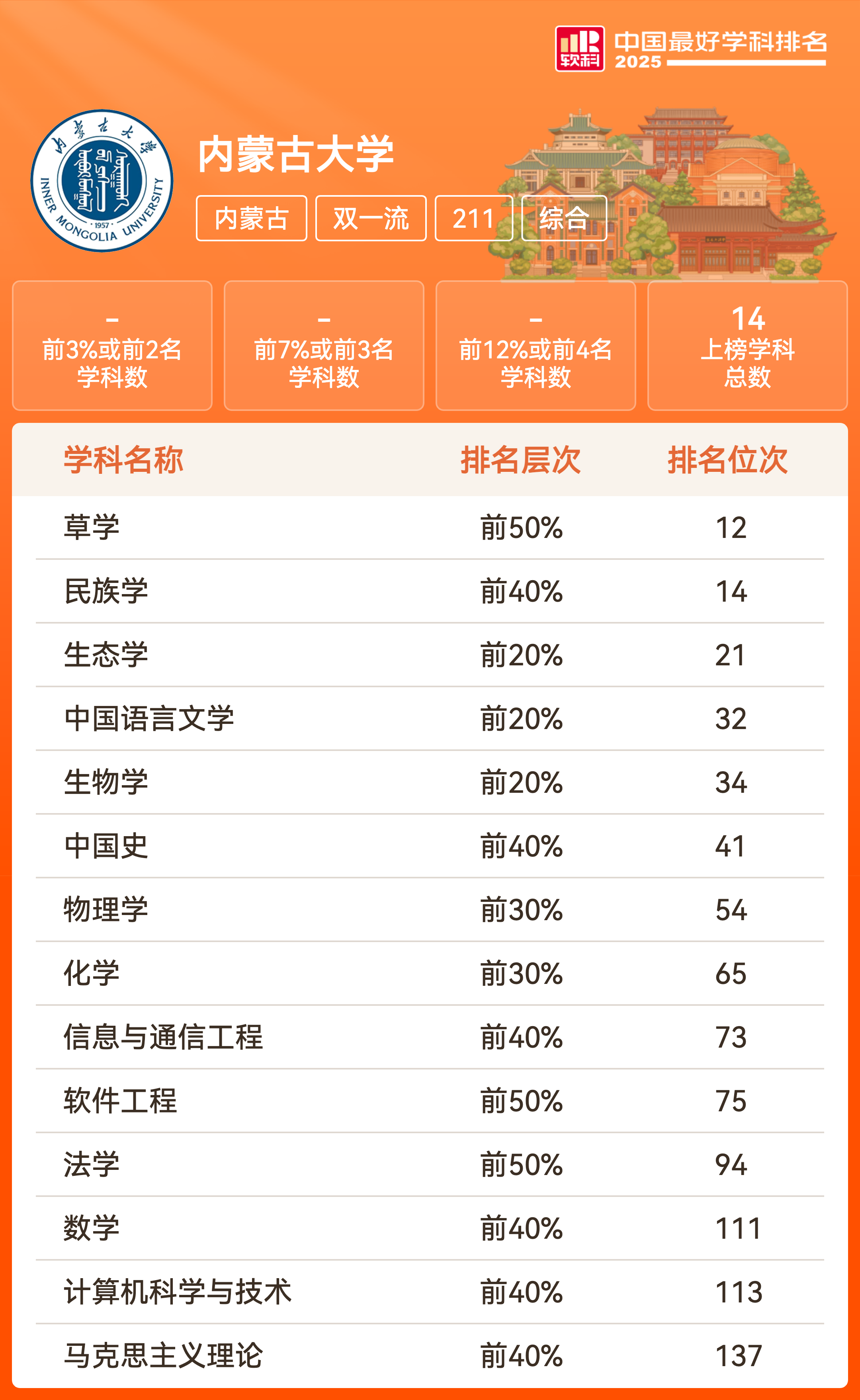 内蒙古大学坐落于呼和浩特市,是教育部与内蒙古自治区人民政府合建高校,为国家世界一流学科建设高校、“211工程”重点建设高校、内蒙古自治区一流大学建设支持高校、中西部“一省一校”国家重点建设大学。学校创建于1957年,是一所综合性大学,1962年开始招收研究生;1978年被确定为全国重点大学;1997年成为“211工程”重点建设高校;2004年成为内蒙古自治区人民政府和教育部省部共建大学;2012年入选中西部高校综合实力提升工程;2016年被国务院确定为中西部“一省一校”国家重点建设大学;2017年入选为国家世界一流学科建设高校;2018年成为教育部与内蒙古自治区人民政府合建高校。