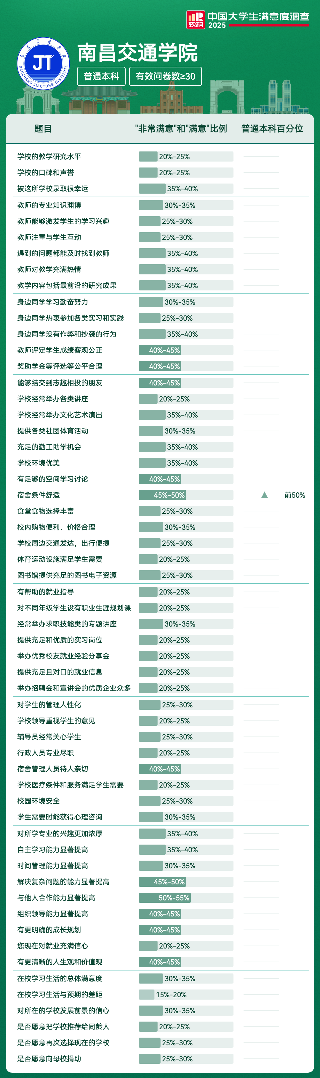 | 宿舍条件舒适 | 45%-50% | 前50% |