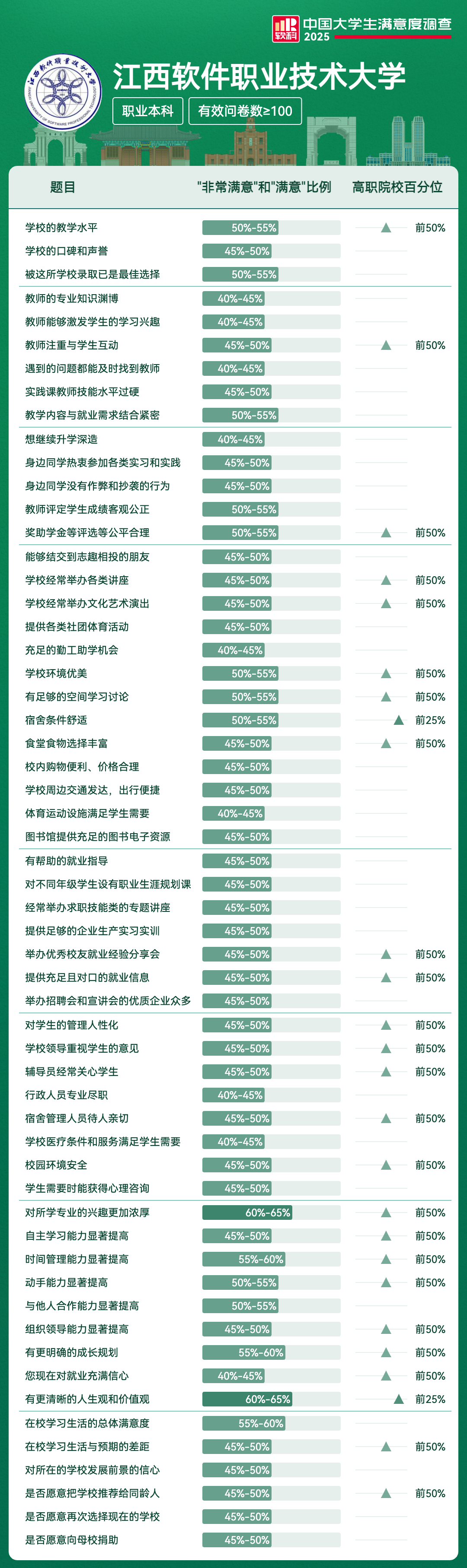 | 宿舍条件舒适 | 50%-55% | 前25% |