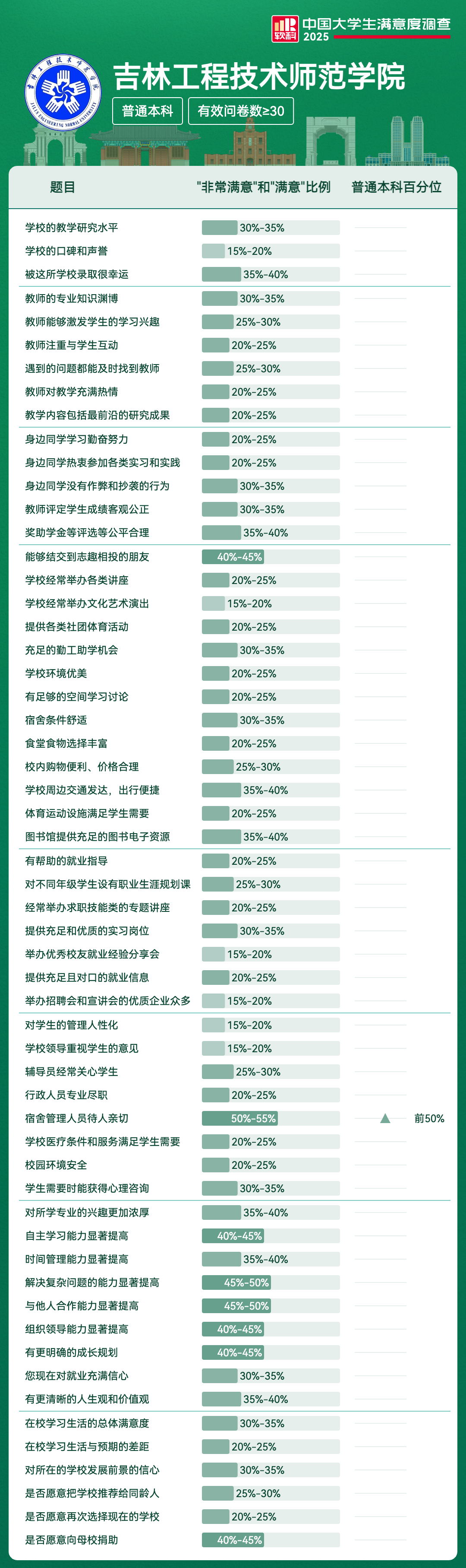 | 宿舍管理人员待人亲切 | 50%-55% | 前50% |