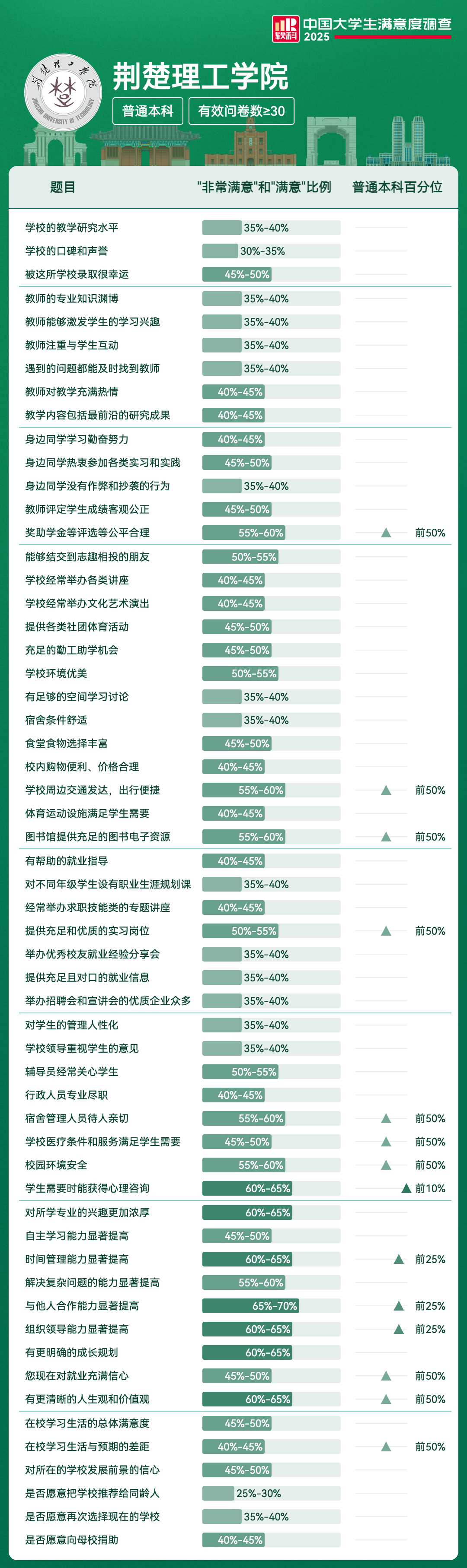 | 满意度前5项 | 满意及以上比例 | 全国高校排名区间 |